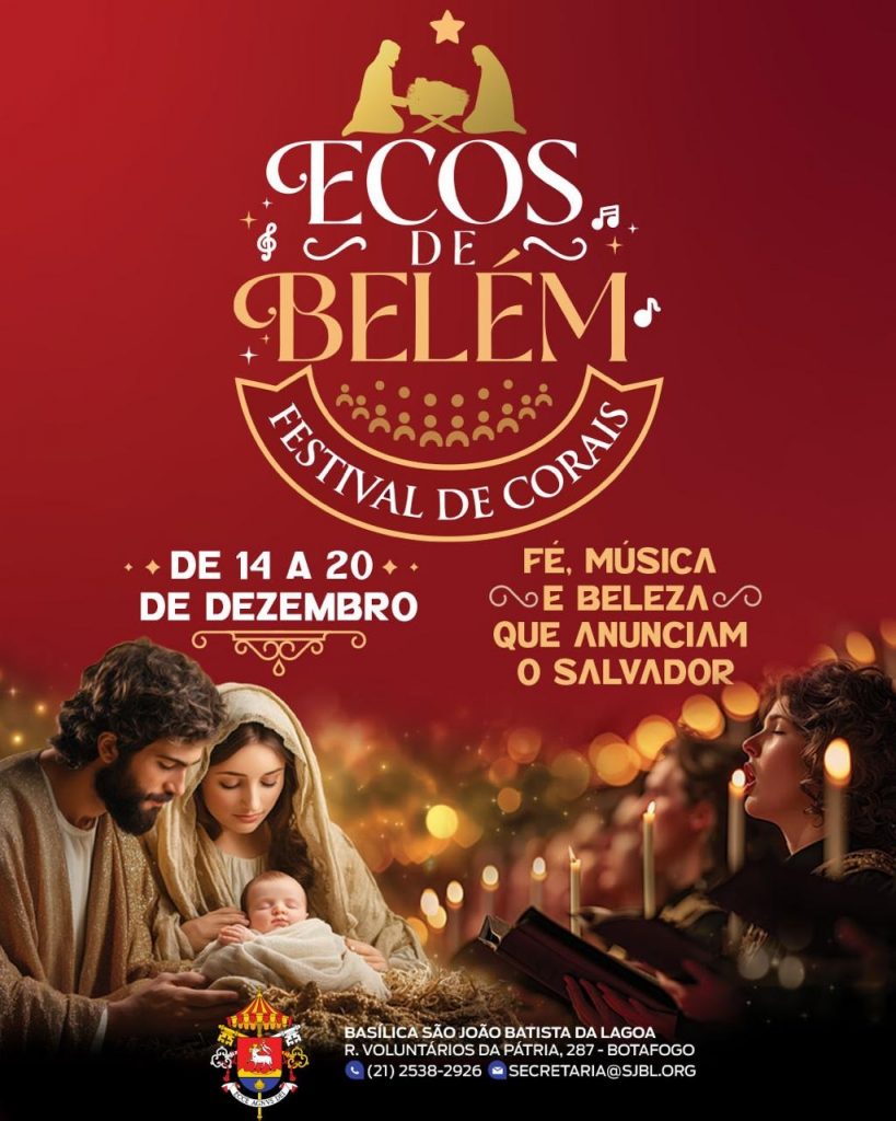 A Basílica São João Batista da Lagoa, em Botafogo, realiza neste ano de 2025 a 1ª edição do Festival de Corais “Ecos de Belém”, que acontece de 14 a 20 de dezembro, reunindo corais das paróquias da Zona Sul do Rio em uma nova e significativa iniciativa cultural e espiritual para a cidade.