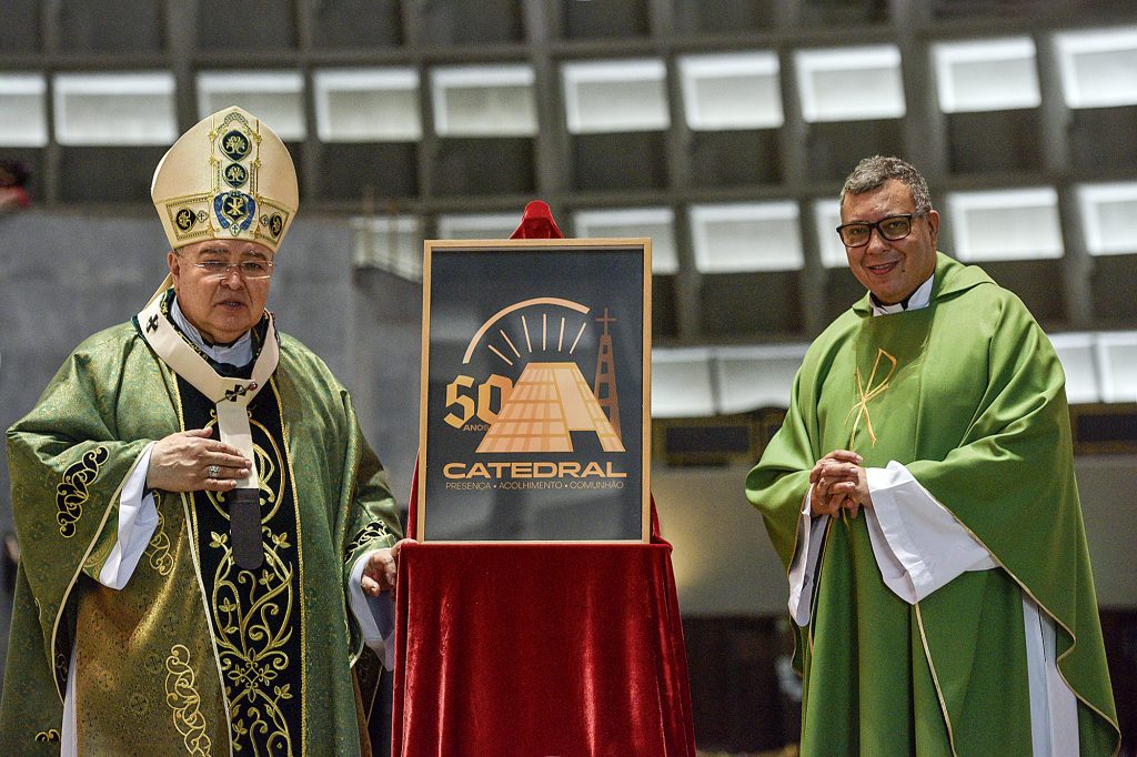 O cônego Cláudio dos Santos destacou ainda que, na mesma data, a Catedral celebrava 349 anos de sua criação, dos quais 49 já vividos no local atual. Encerrando sua fala, convidou o arcebispo a apresentar a marca jubilar ao povo: “Esta logomarca marca o jubileu da nossa Catedral de São Sebastião e traz para cada um de nós o significado destes cinquenta anos.”