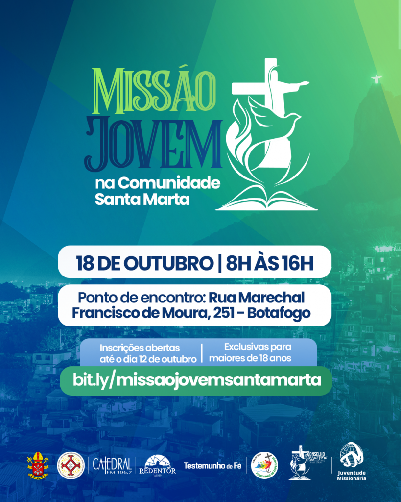 No dia 18 de outubro de 2025, a Comunidade Santa Marta, em Botafogo, será o local de um grande encontro da juventude missionária da Arquidiocese do Rio de Janeiro. A iniciativa, chamada Missão Jovem, pretende reunir jovens a partir dos 18 anos para um dia inteiro de evangelização, oração, convívio e testemunho de fé. A programação começa às 8h e se encerra com a missa das 16h. O ponto de encontro será na Rua Marechal Francisco de Moura, 251, próximo à Praça Santa Marta.